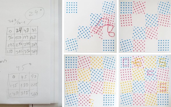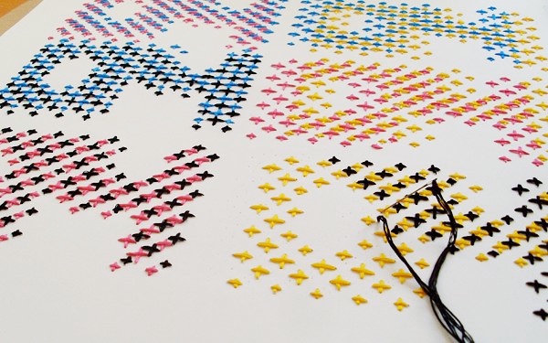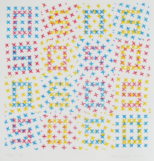 “My work is a series of 5 hand-stitched posters where I look at ornament as a mechanical repetitive process. It is a study of moiré patterns. Moiré effect occurs in print when halftone screens are superimposed at certain angles. These posters play with moiré as a visual phenomenon. Series of patterns are created by using halftone dots at different size, angle and spacing. These patterns are stitched using combinations of CMYK colours. Numbers from 01 to 05 in posters become visible from a distance.“
