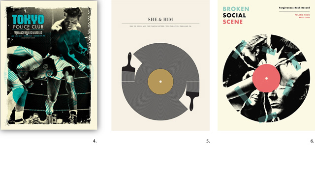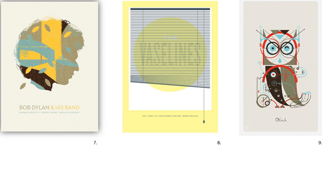 Credit: Poster Cabaret 1. Float print by Jennifer Davis2. Mademoiselle under the rain print by Blanca Gomez 3. Doom print by Aesthetic Apparatus 4. Tokyo Police Club concert poster by Vahalla Studios 5. She Him 2010 concert poster by The Small Stakes 6. Broken Social Scene poster by Doublenaut 7. Bob Dylan concert poster by Vahalla Studios8. The Vaselines Concert Poster by The Small Stakes 9. Owl by Leandro Castelao